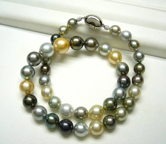 大きさは8ミリ~20ミリ程度、アコヤ真珠(和珠)より大きいとされる12ミリ以上の珠がよく使われまっす。色はホワイト系がメインで、シルバー・クリーム・ゴールド・ブルーなどなどありまっす。丸珠で無傷で和珠の花珠のように質がイイモノは本当に稀で、特にそれでいて15ミリ以上の大粒となると、一粒で数百万円とかしまっす。美術品として今日ある、かつての西洋の女王様の肖像画なんかで身に着けてる真珠も大抵コレっす。まさにお宝っすね。