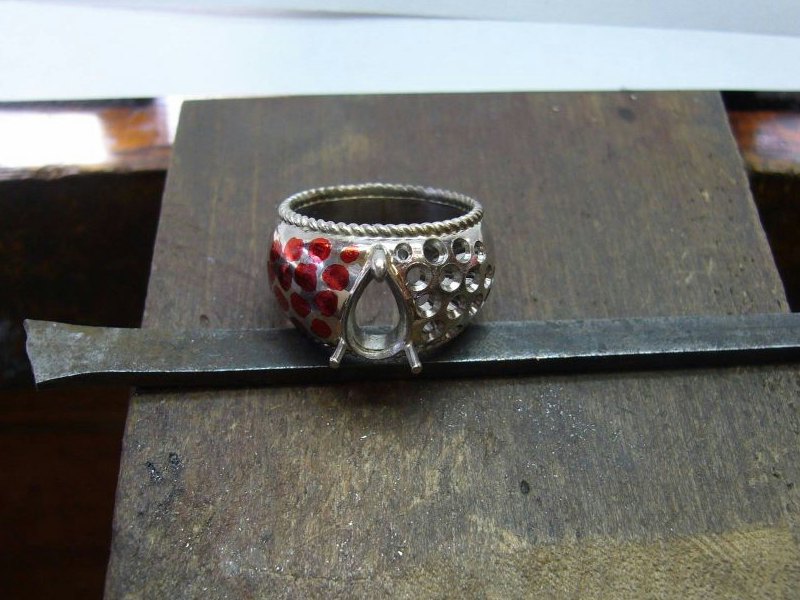 ←の場合、サイズがまちまちのタイプだったので、ある程度目測でマーキングした後に、下穴開け・座もみ作業で一個一個宝石を合わせていってパヴェ(石畳)状に並べてまっす。