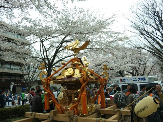 町会の神輿も出てるらしく、桜並木に神輿行列になってて結構な賑わい。