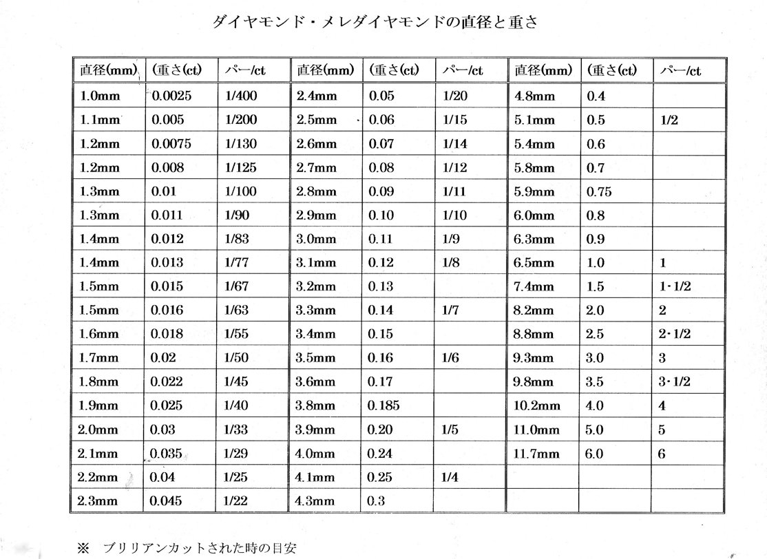 ダイヤモンド メレダイヤモンド 直径 重さ mm カラット ct サイズ 表 サイズ表