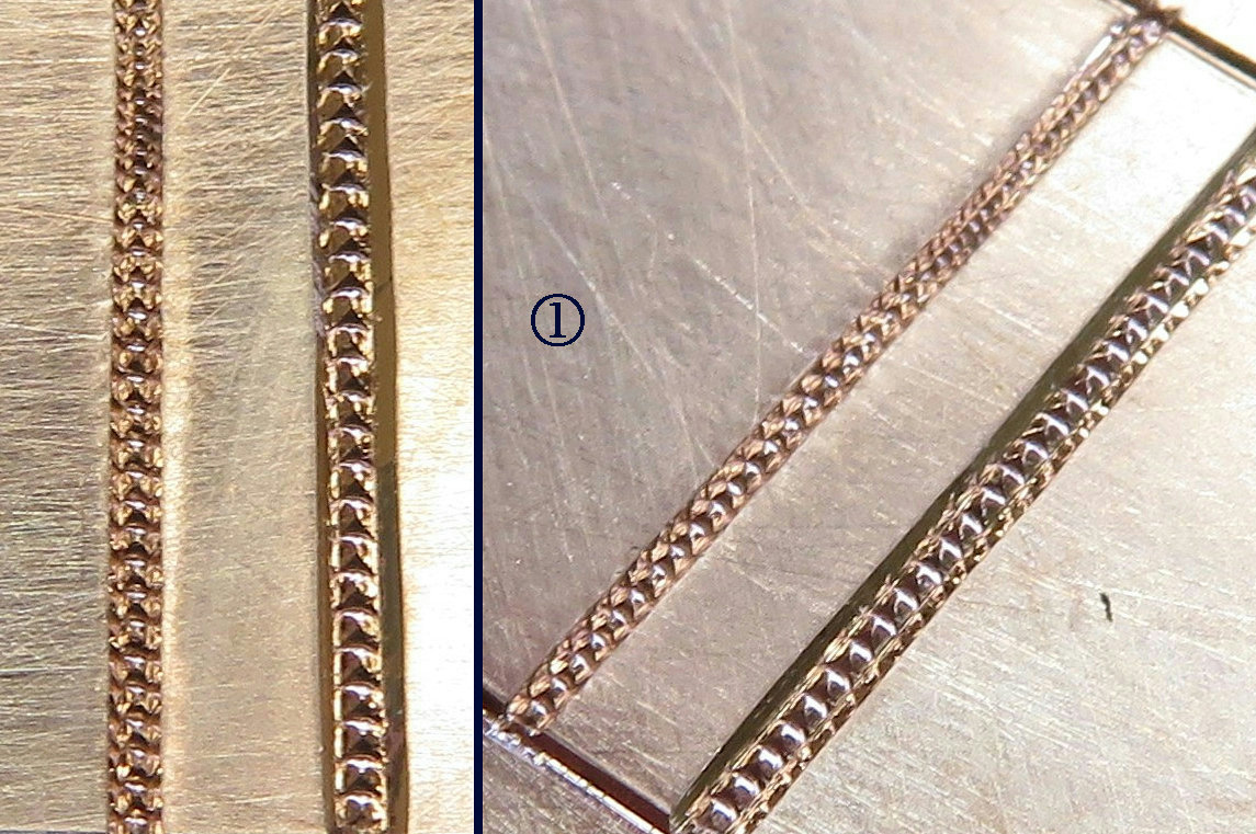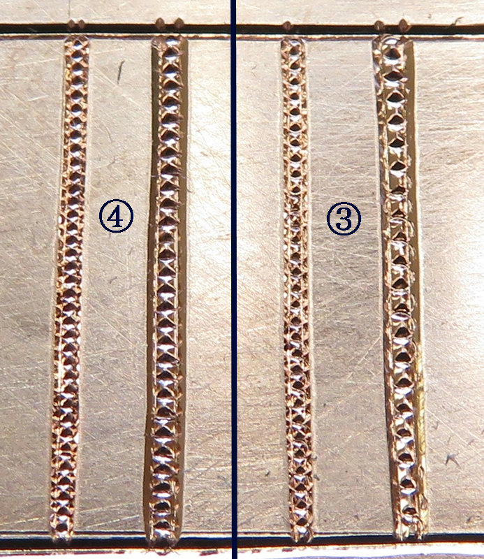 ③の方はピッチが広がり丸の跡やバリが残ります。