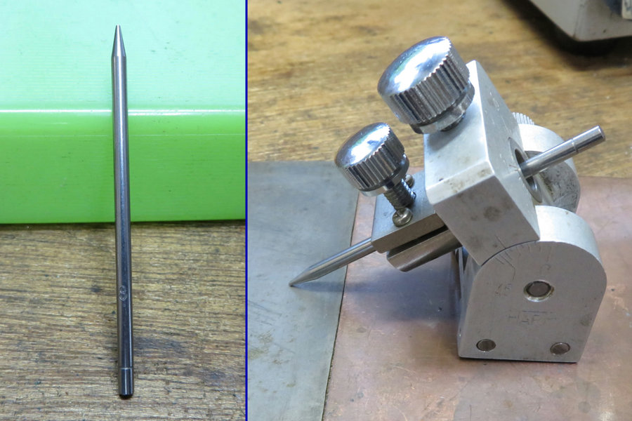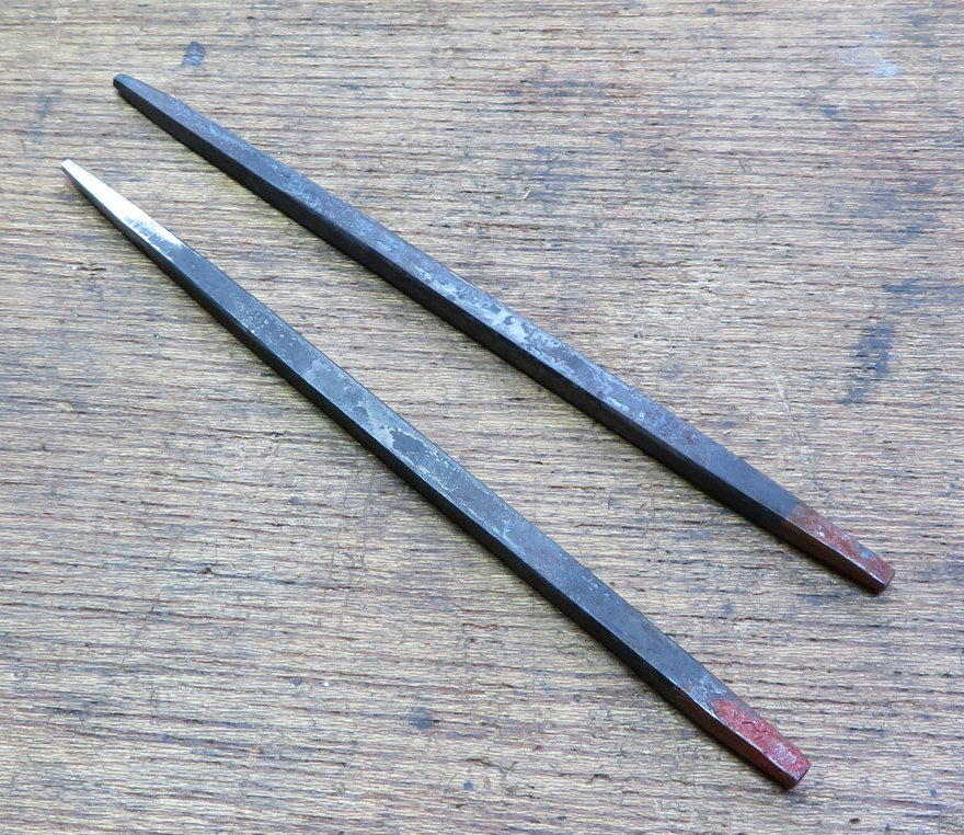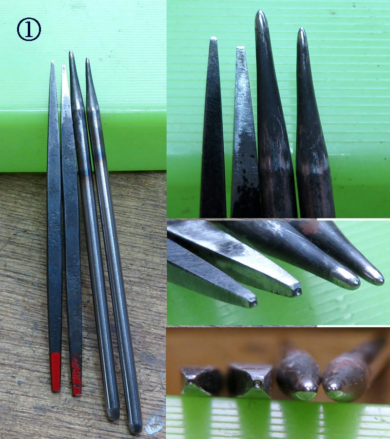 右側画像の初期状態のタガネにヤスリをかけたり、左側画像のポンチ打ったり加工して