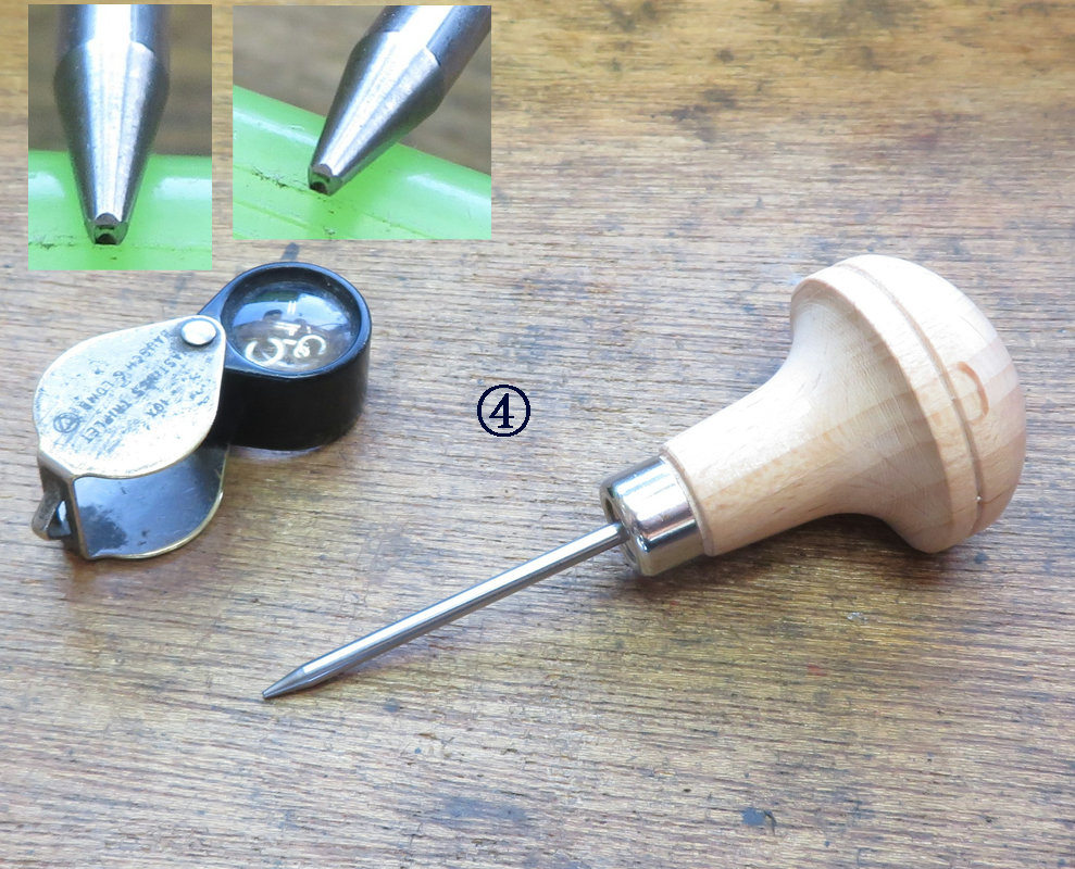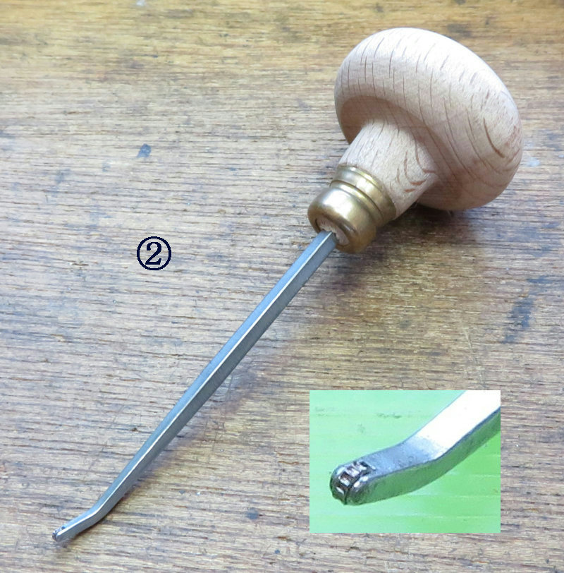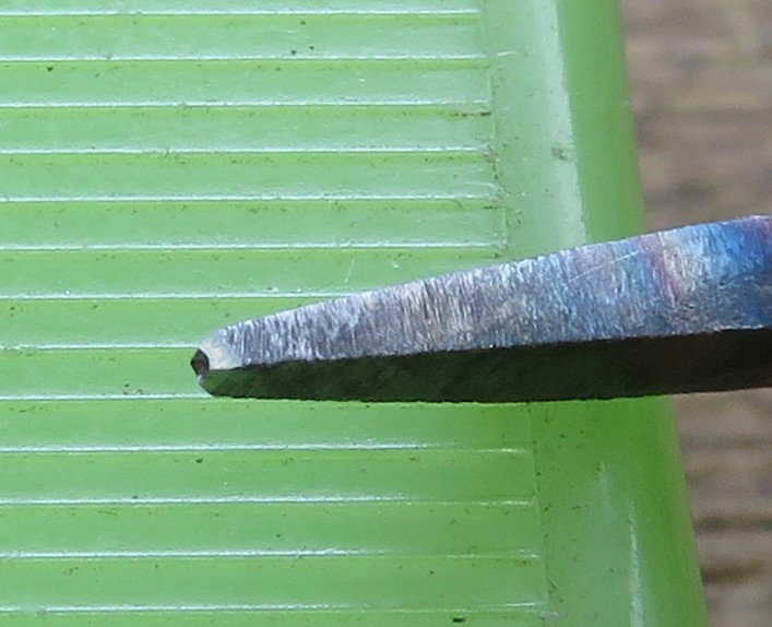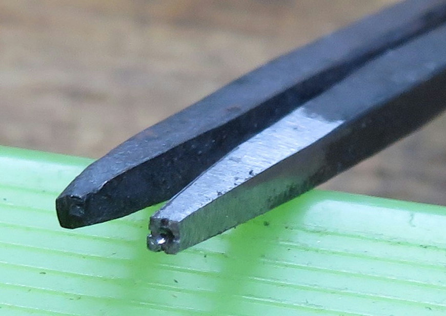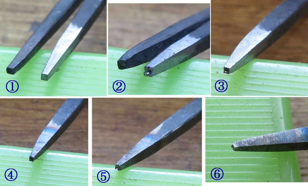 ① 株、初期状態のタガネの先端を平らにして四角にヤスリ掛け② 軽く糸鋸で十字に切って、センターにお手製のポンチを打つ③ 打ったポンチ跡に合わせて更に四角にヤスリ掛け④ 焼き入れをする⑤ ポンチ跡を青棒で磨く⑥ 先端が四角、やや長方形になるよう砥石で刃を付ける