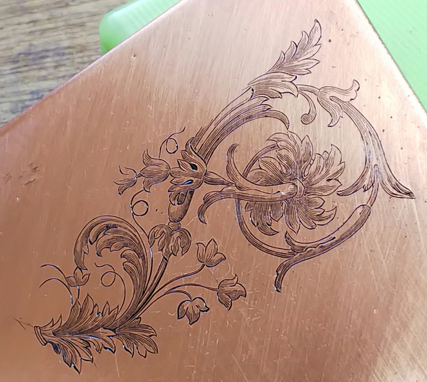 外側・フチ側は毛彫りで、中心部は片切で彫り入れ。